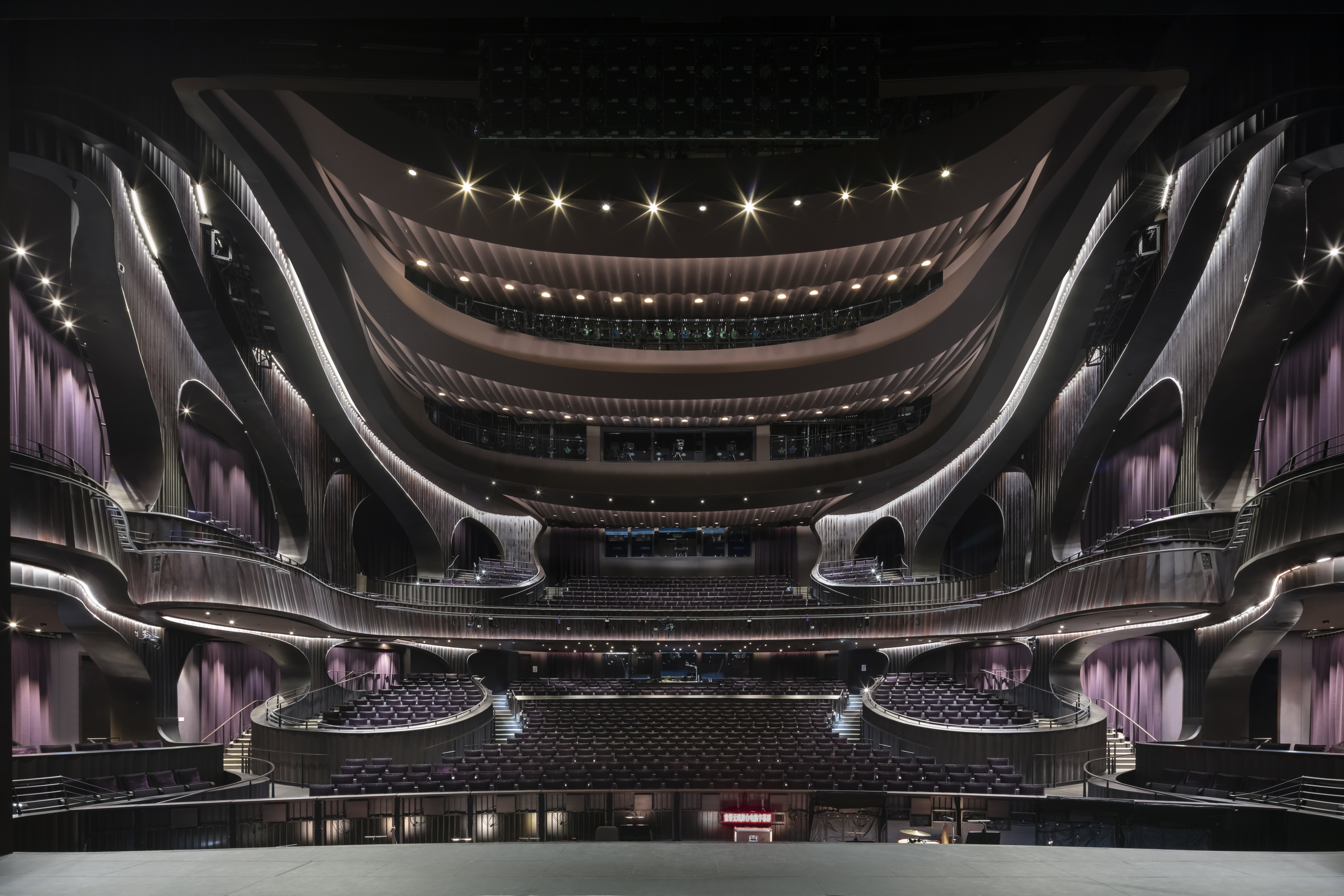Scalloped vertical edges placed throughout the hall scatter the sound from the stage in multiple directions, providing a natural acoustic that further sustains Xiqu vocals. CNC-cut concave wooden modules are inset with either fabric and insulation for absorption, or metal for reflectivity depending on their location in the room. Transformable acoustic devices such as curtains and banners integrated into the audience chamber further support clarity of amplified and unamplified sound for various performance types. These measures collectively achieve a Noise Criterion (NC) rating of 15, reflecting world-class acoustics that respect and enhance the nuances of Xiqu.
