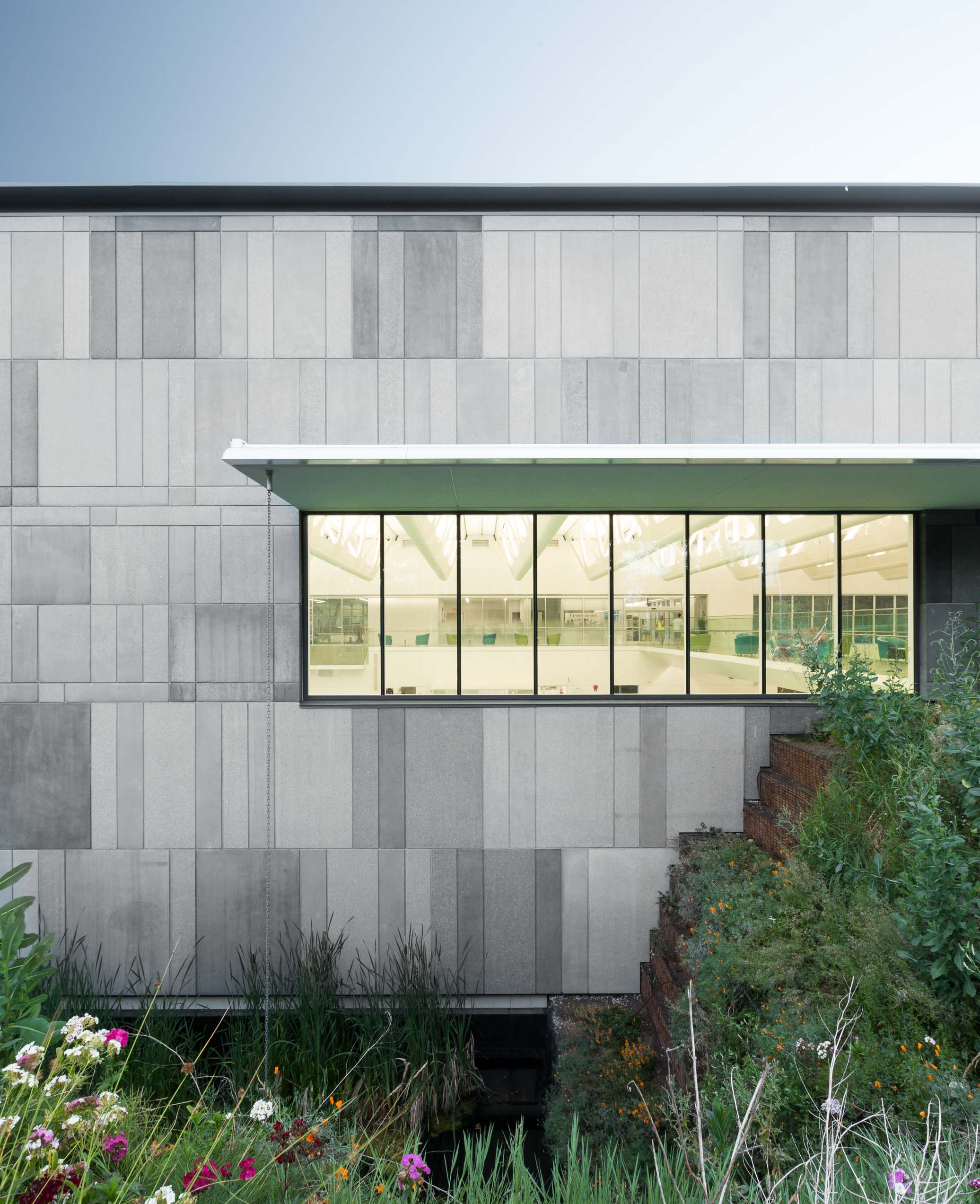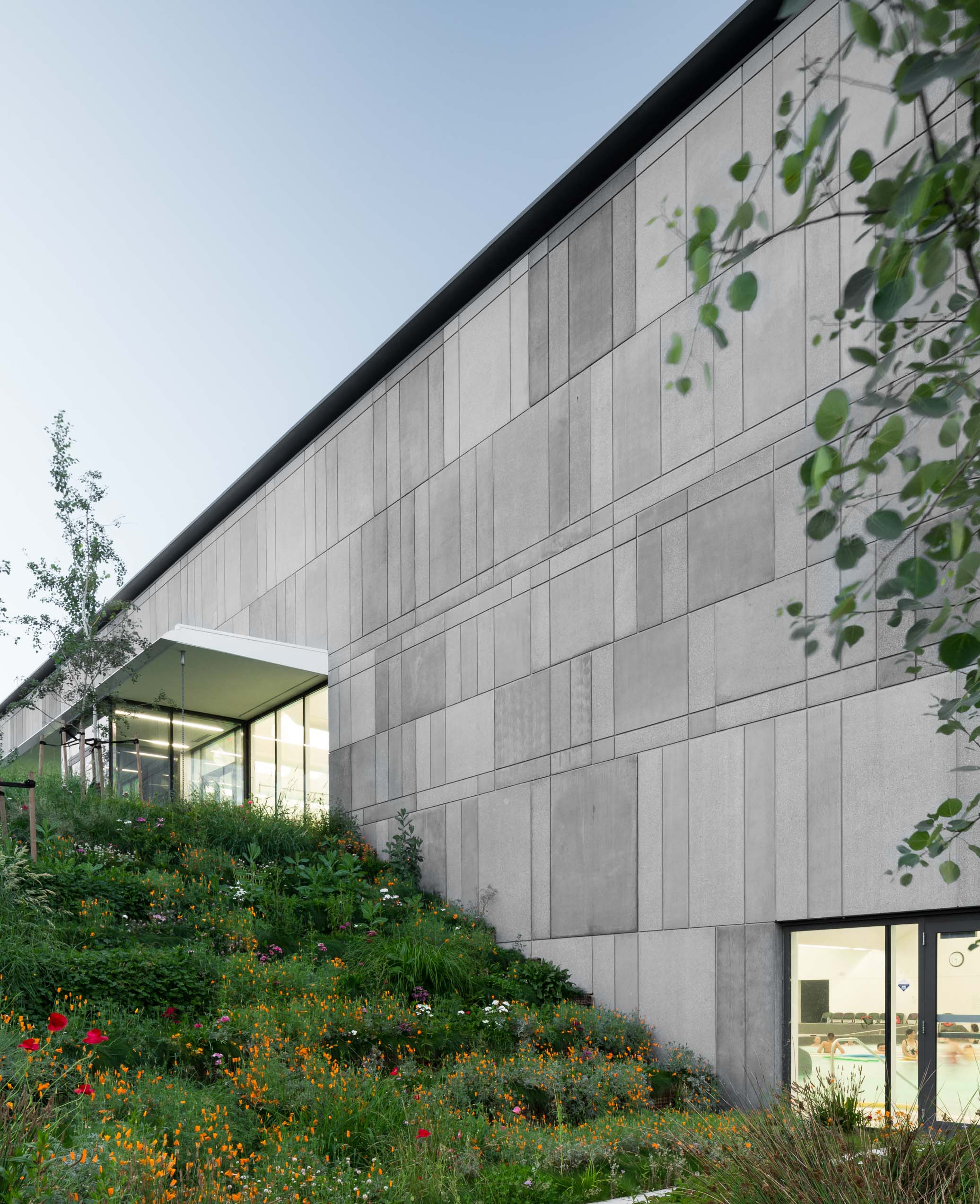 The fluidity of the landscape enclosing the building was strategically designed to accommodate the site’s existing slopes and provide pedestrian entry points. Furthermore, earth from construction excavation was creatively re-appropriated to form a new terrain along the principal façade, incorporating a detention pond system that doubles as an ecological visual amenity.