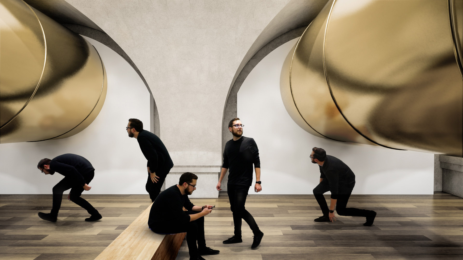 Visitors to Revery’s ‘DUCkT’ installation at London’s Design Biennale will be presented with two exaggerated metal air ducts crossing over the gallery. Made from reflective golden aluminum to prompt a sense of awe and splendour, the ducts also provoke personal reflection (figuratively and literally) towards a common threat. DUCkT forces the viewer to duck beneath, touch, hear, and feel the objects responsible for our thermal comfort, experiencing the desirable warmth and coolness, linked to the unpleasant acoustic pollution and physical discomfort, as an analogy for our current way of building.