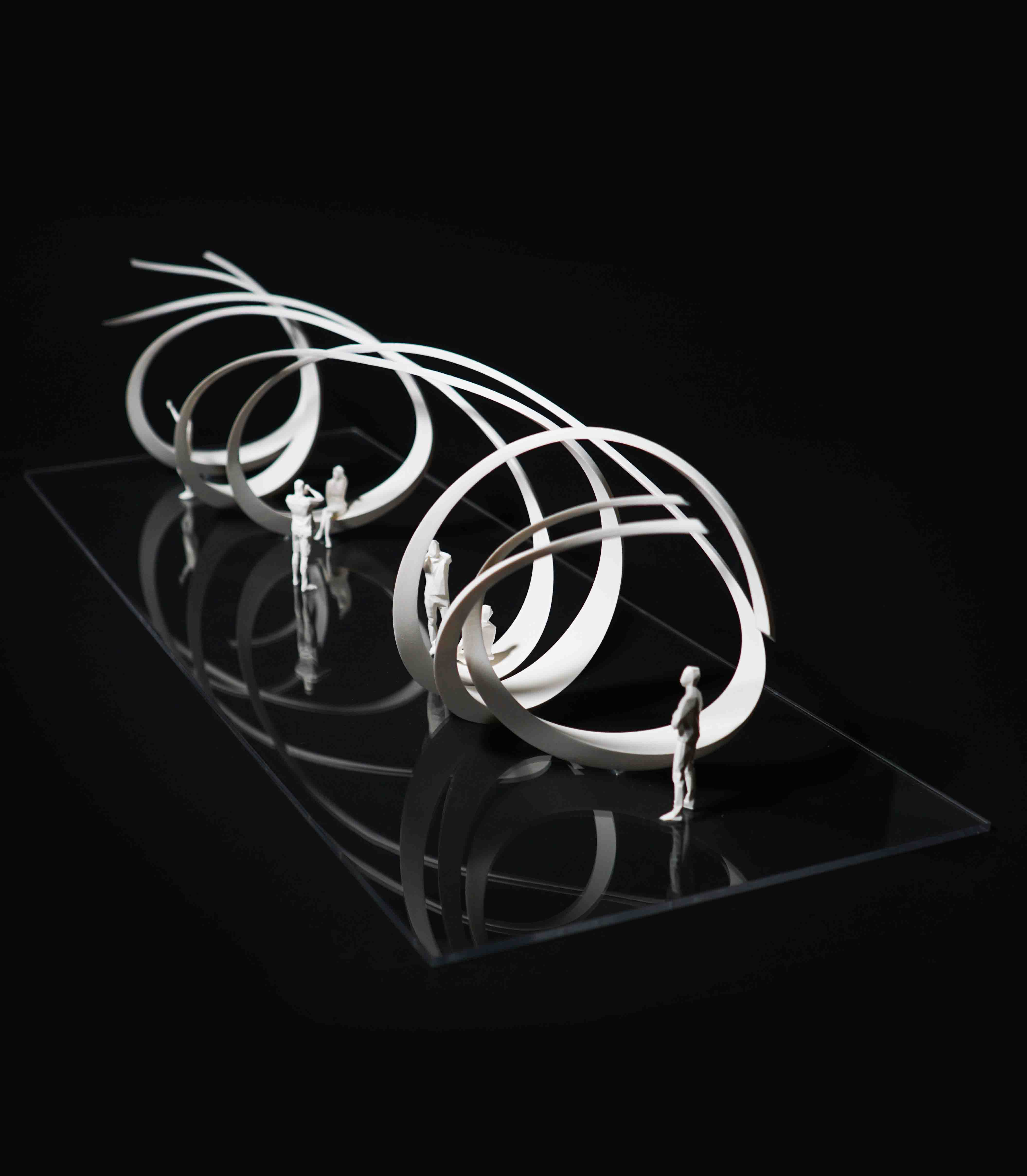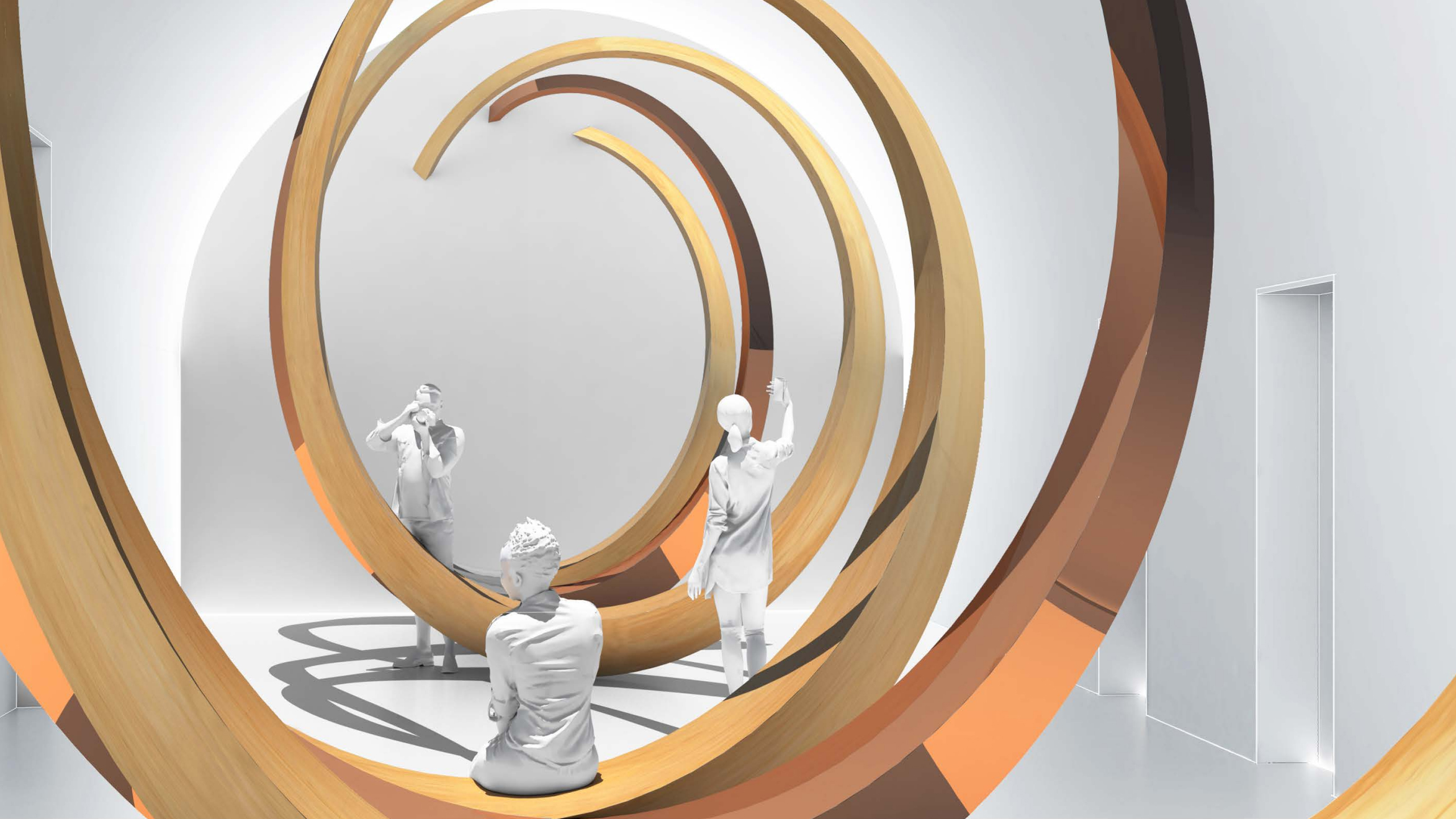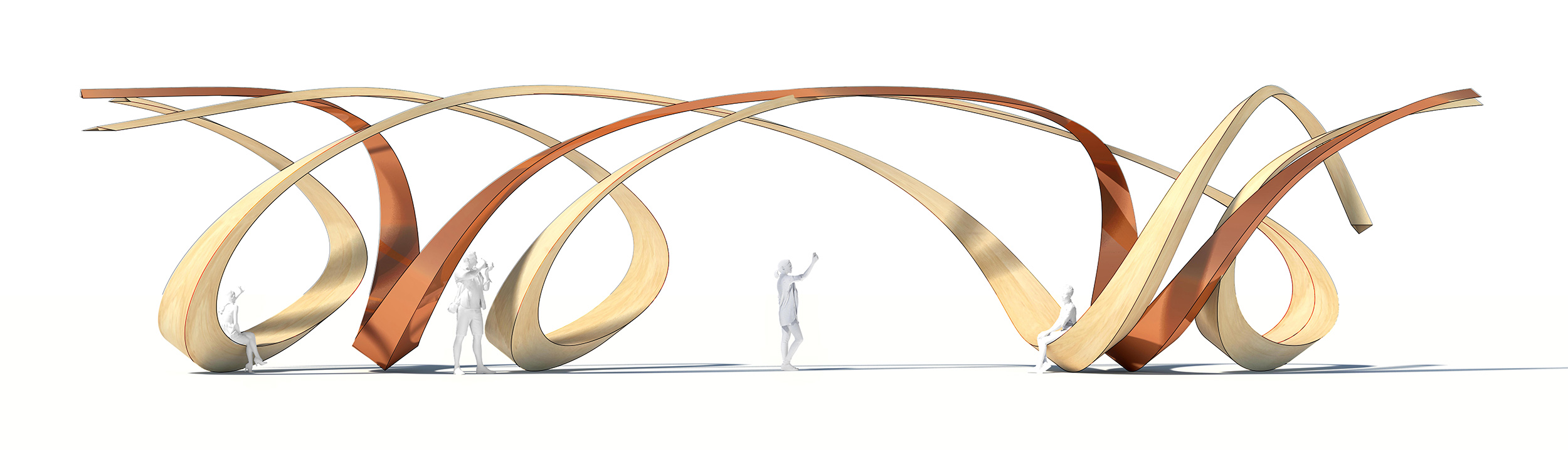 Three spiraling ribbons form this custom-designed installation that functions as both a bench and for spatial separation. Designed to be fabricated from steel and cross-laminated timber, with two ribbons finished in wood and one in copper.