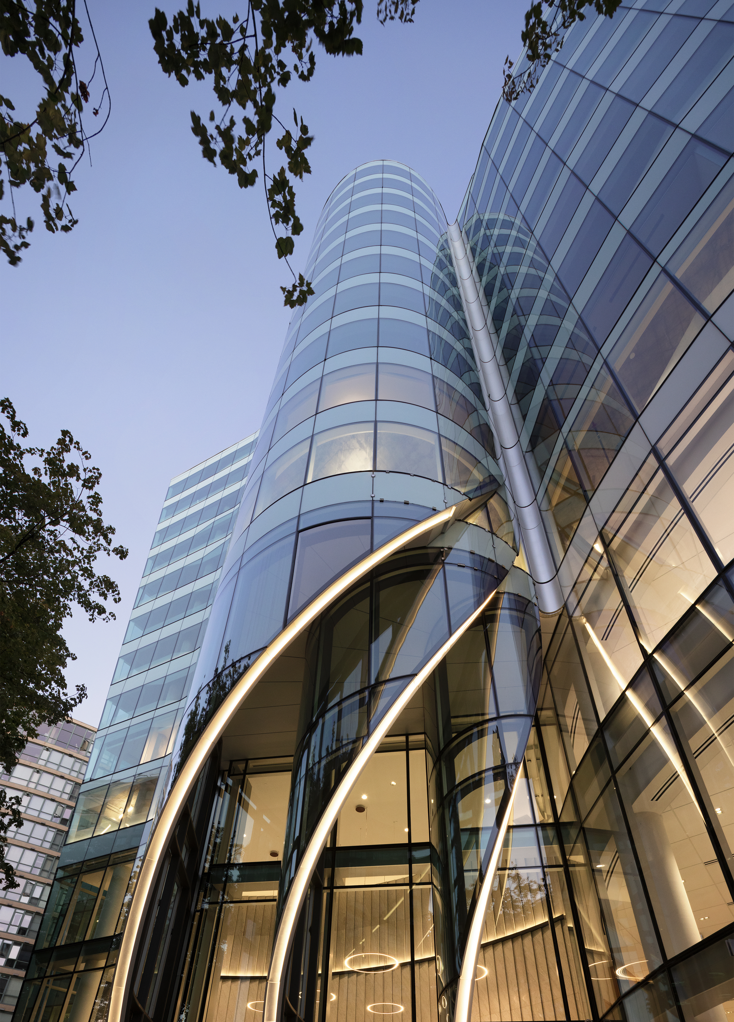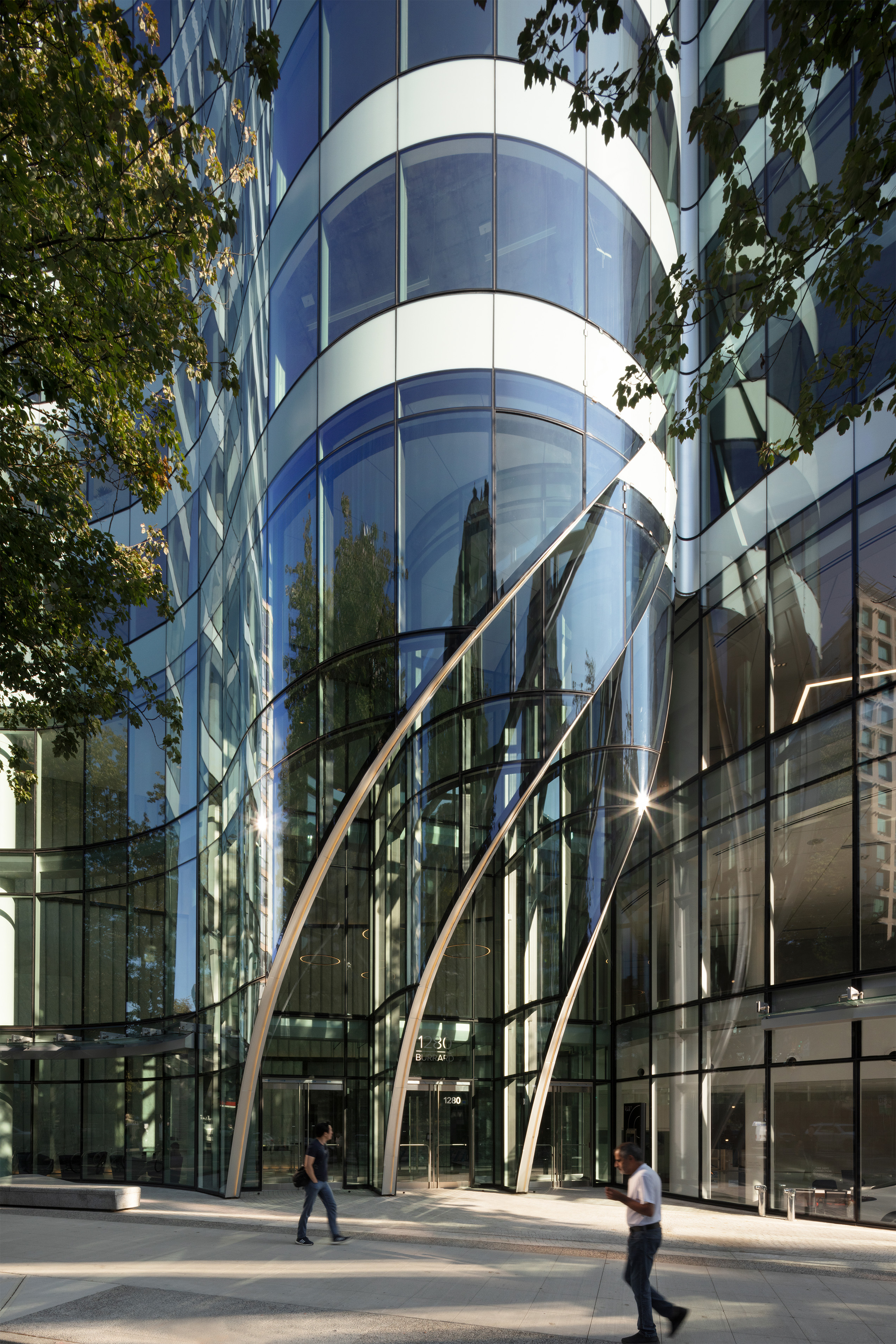 Inspired by the unfolding pages of a book, the building allows each tenant and visitor to participate in the narrative of the site. The undulating form sculpts a welcoming street-level plaza and a clear entry to the building, while functioning as passive self-shading during the summer months, when solar heat gain is critical. This architectural form also mitigates glare and optimizes expansive view opportunities.