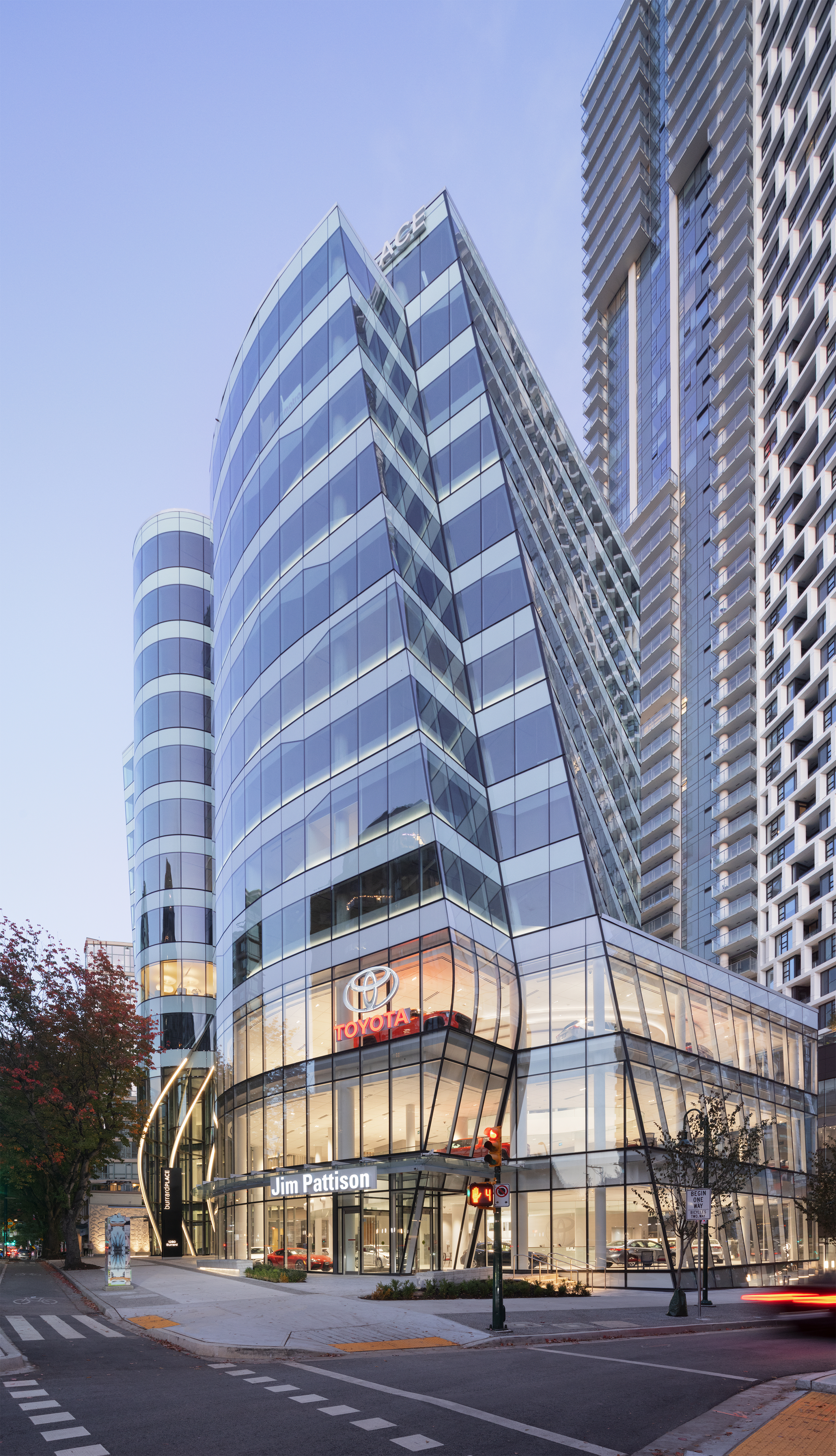 At its core, this building prioritizes the connectivity between its private space and public realm to emphasize urban integration and community spirit. At grade level, the building is anchored to its urban context through thoughtful landscaping and a prominent automobile showroom at the corner of Burrard and Drake. This showroom is conceived as a ‘house of mirrors’, with cars and shoppers appearing to float within the large open volume.