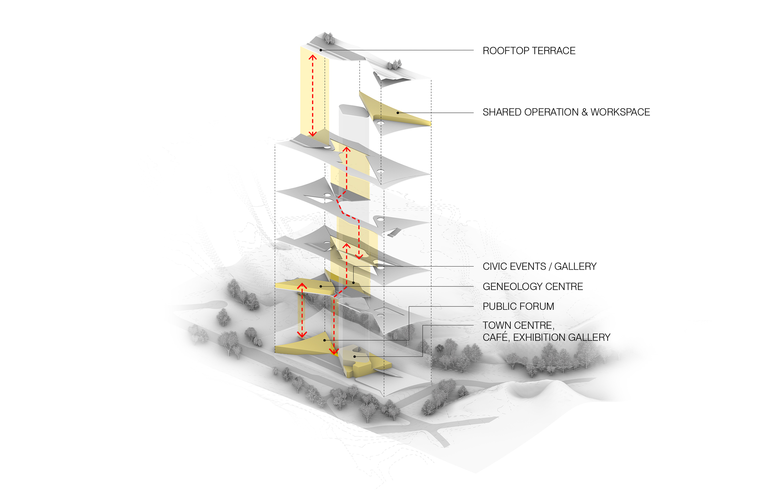 Recognizing the significant views from the site towards key Ottawa landmarks, the north and south façade connect users to protected vistas. Lifting the central mass of the building connects the library to the public realm, inviting users and creating paths through the building. A central atrium oculus forms a captivating focal point around which key programs are oriented and brings daylight deep into the building. As users ascend around the oculus along alternating pathways, a gradual unveiling of the program, site, and context occurs until the full surrounding landscape is experienced from the accessible rooftop.