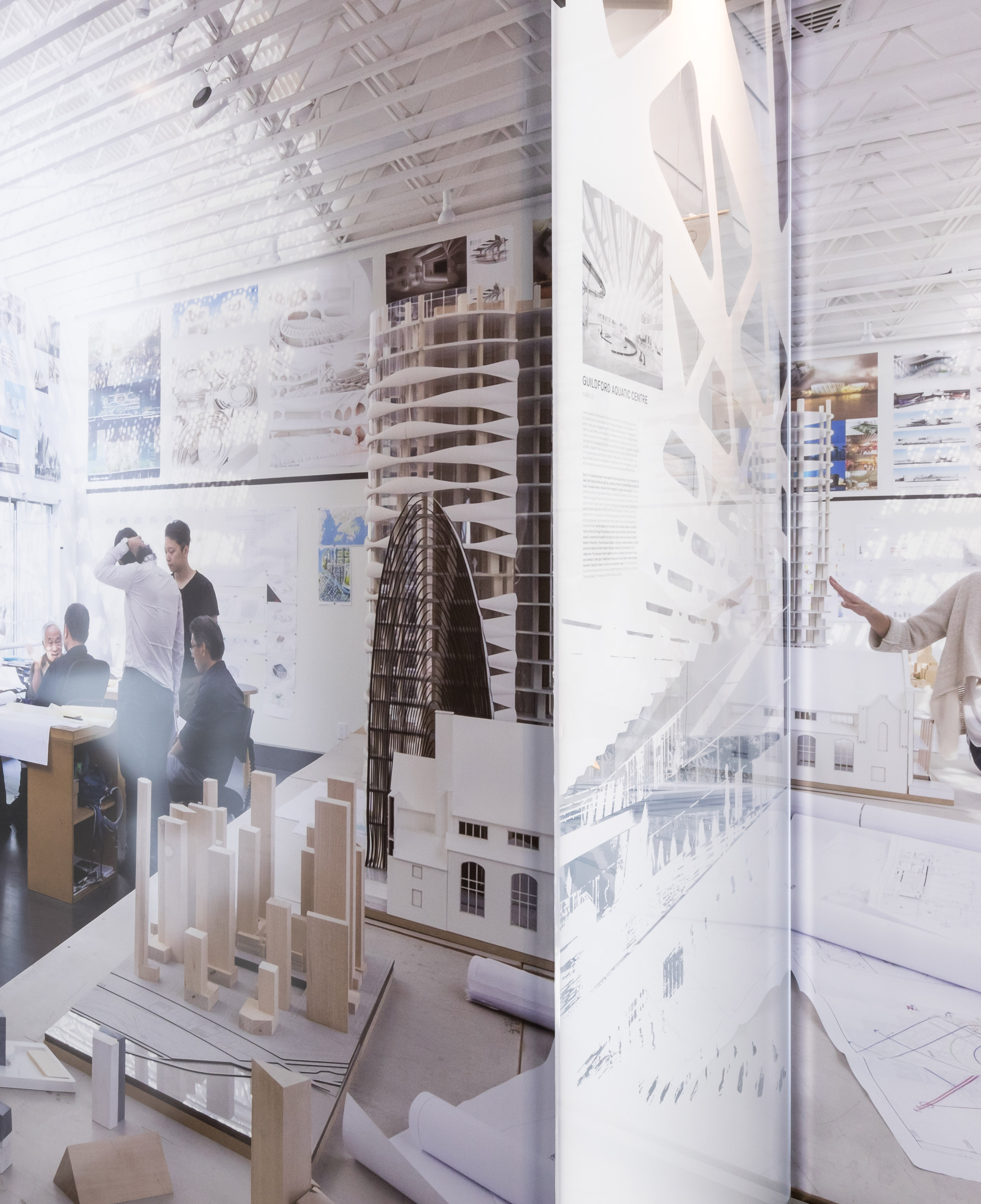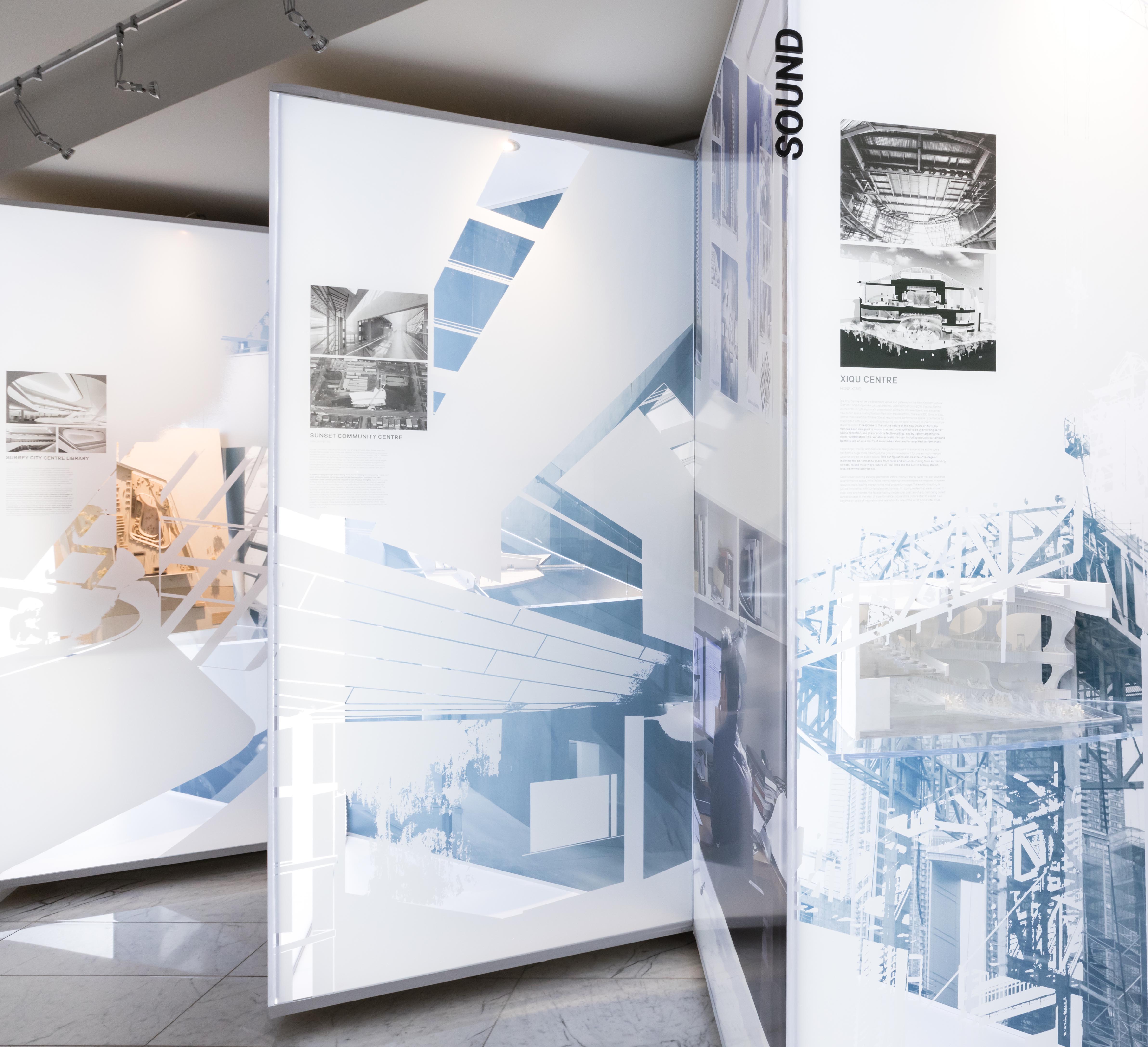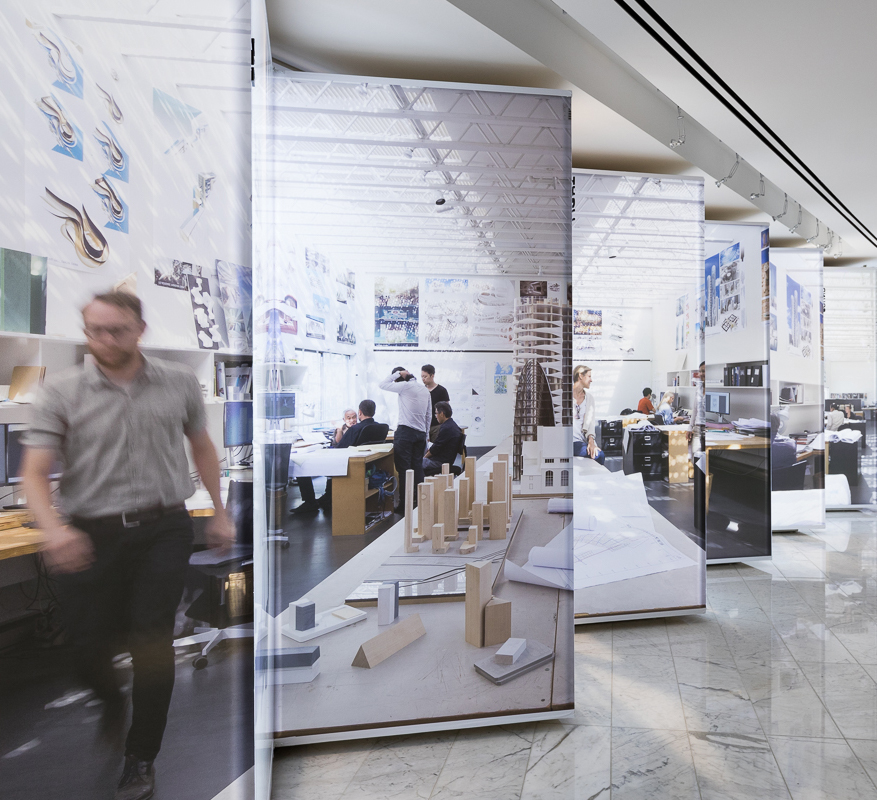 The intention of the exhibition was to present the Studio’s design process. Vignettes of the design studio floor are coupled with project processes grouped in 4 themes: Light, Sound, Time, and Memory.