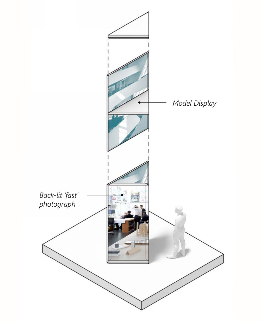 The exhibition display takes inspiration from lenticulated zigzag geometries. When viewed from one side the series of parallel facets align to form a single large image, making them akin to ‘fast’ banners or mechanized signs often found in transit hubs. Viewed from the other side, each facet contains more detailed information, project by project. These ‘slow walls’ allow for more detailed texts and images to be experienced by visitors. Here, they are invited to pause and contemplate the materials as they would in museum setting.