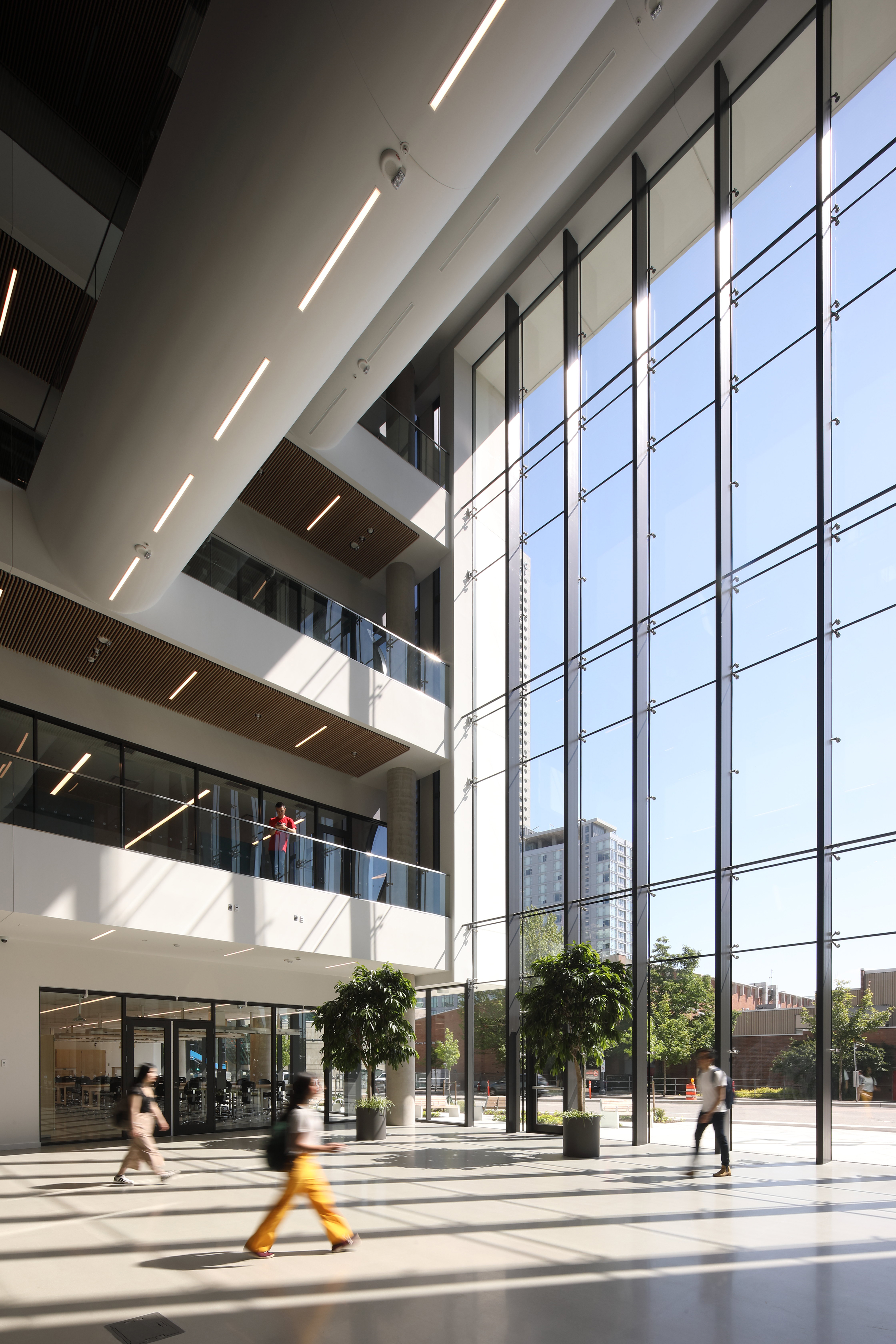SFU SEE’s central grand atrium is oriented to align with an adjacent transit hub, receiving academic and public users through the grand gesture of a large 5-storey curtain. This welcoming transparency, as well as the deliberate locating of community-oriented programs on the ground floor, invites engagement between students, faculty, industry professionals, and the public.
