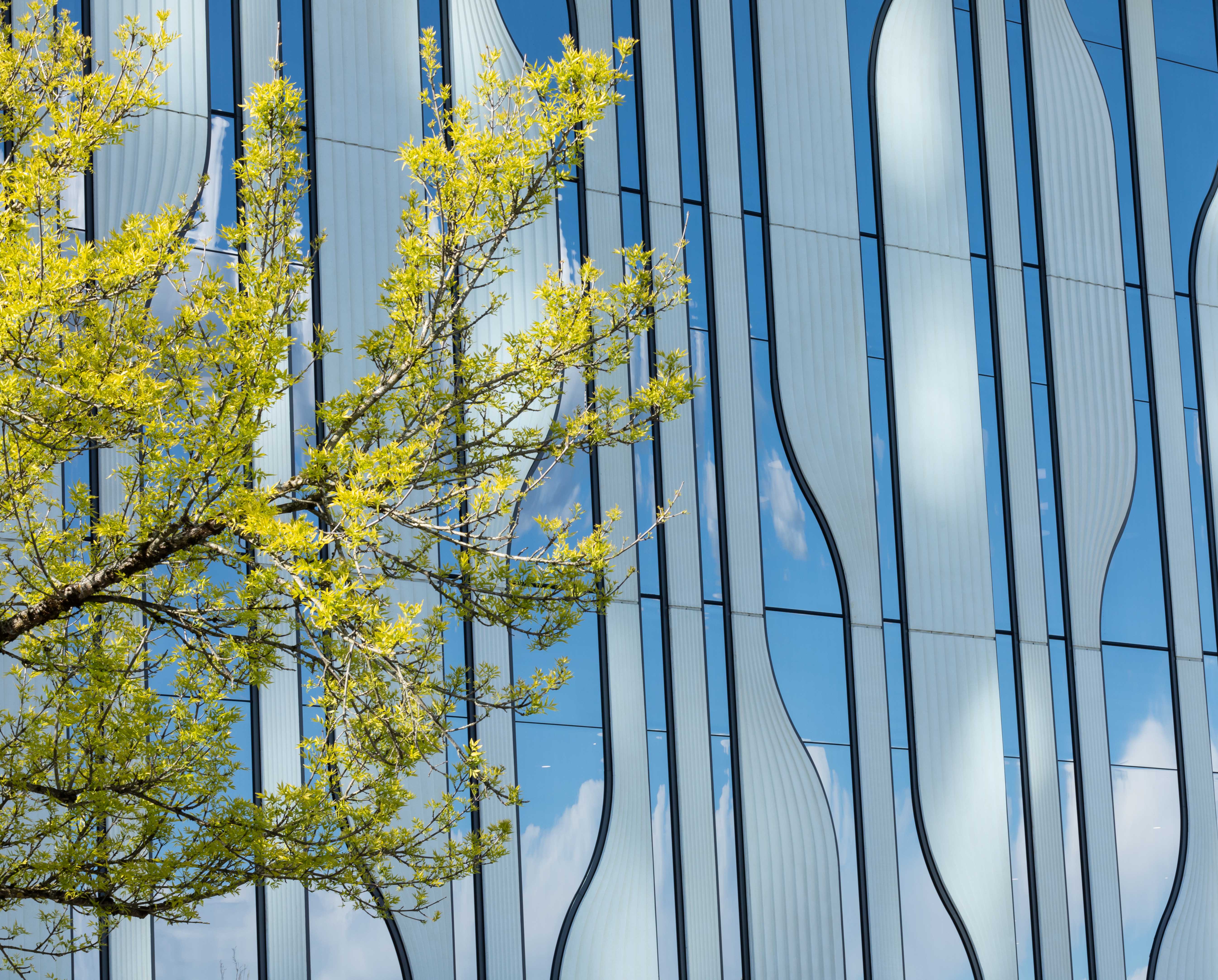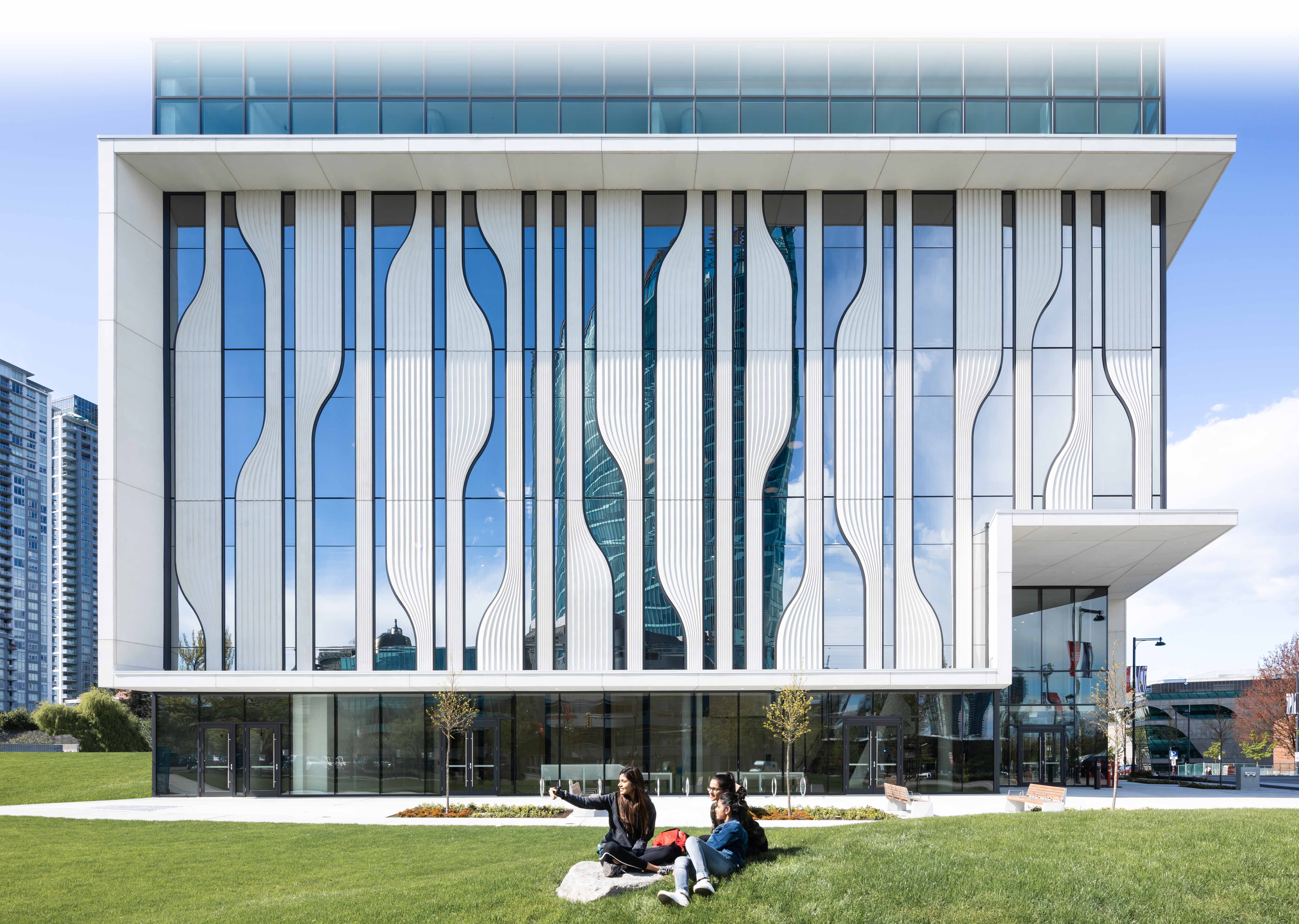 The project’s fast-tracked delivery necessitated significant overlap in design, permitting, and construction phases, and prompted the decision to utilize prefabricated precast elements for the façade, enabling the building to be closed in quickly and minimizing construction debris and noise impact on site. Composed primarily of framed, high-performance, undulating precast concrete sandwich panels and reflective glazing, the façade’s geometric design derives from abstracted circuit board imagery to symbolize the technological subject matter taught within the building.