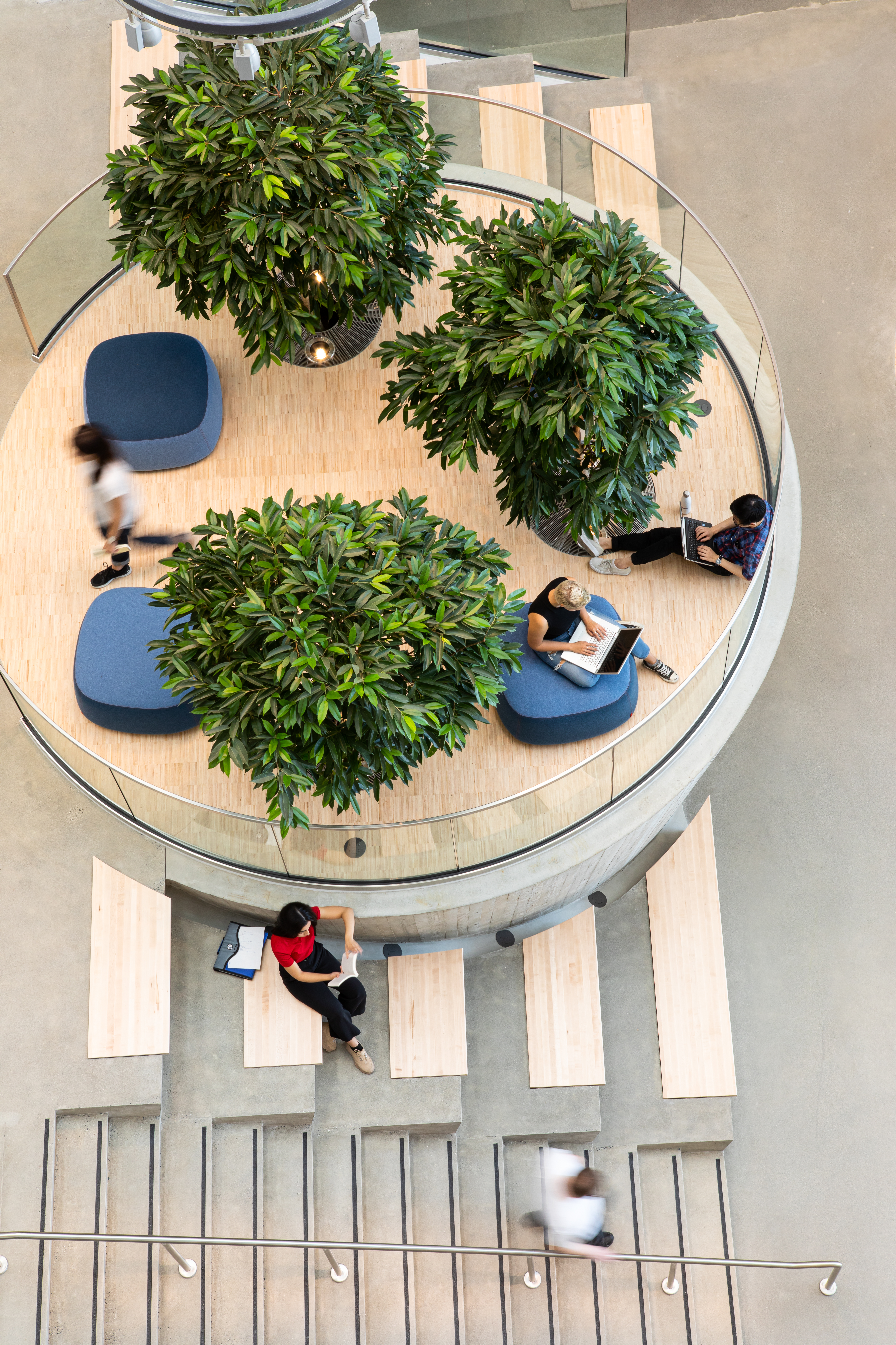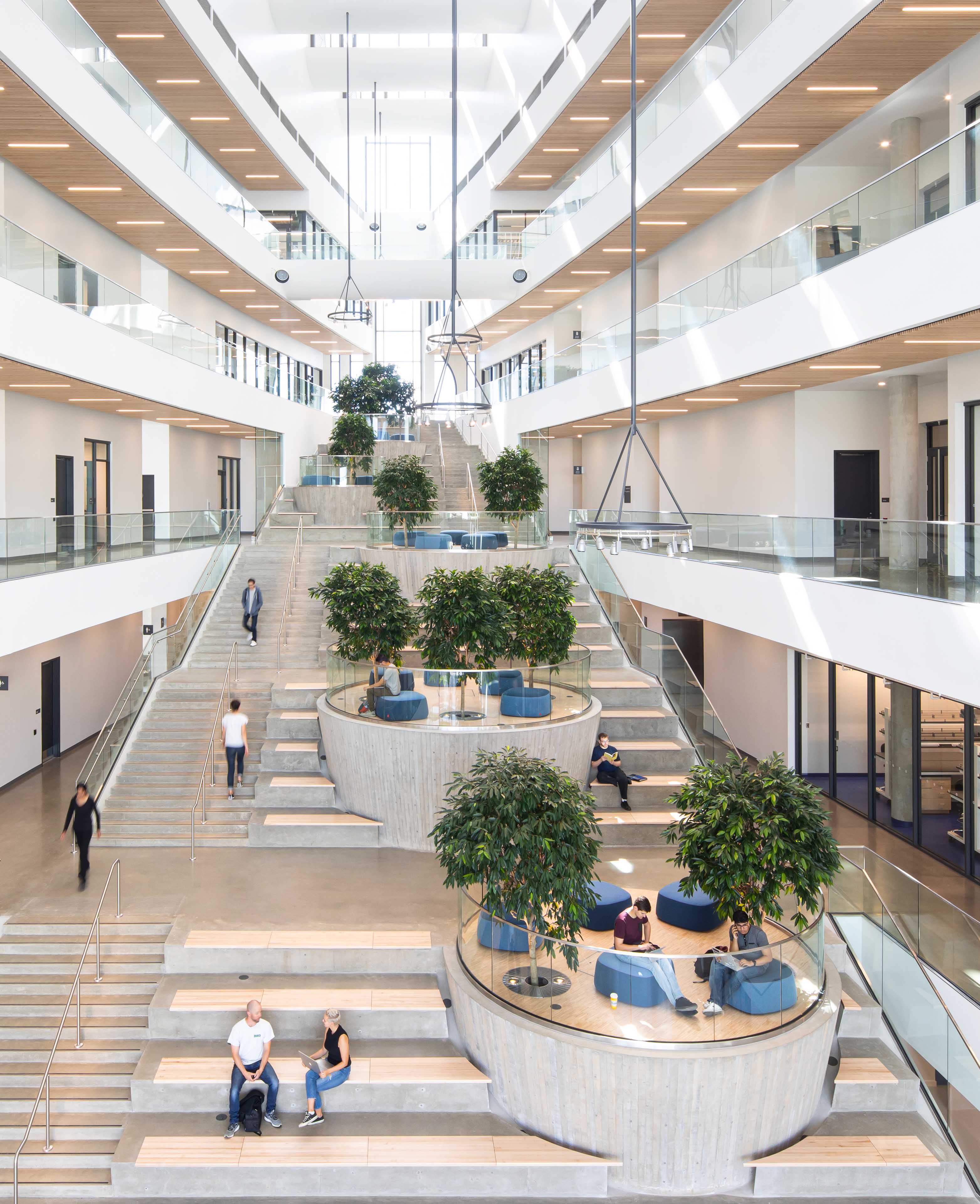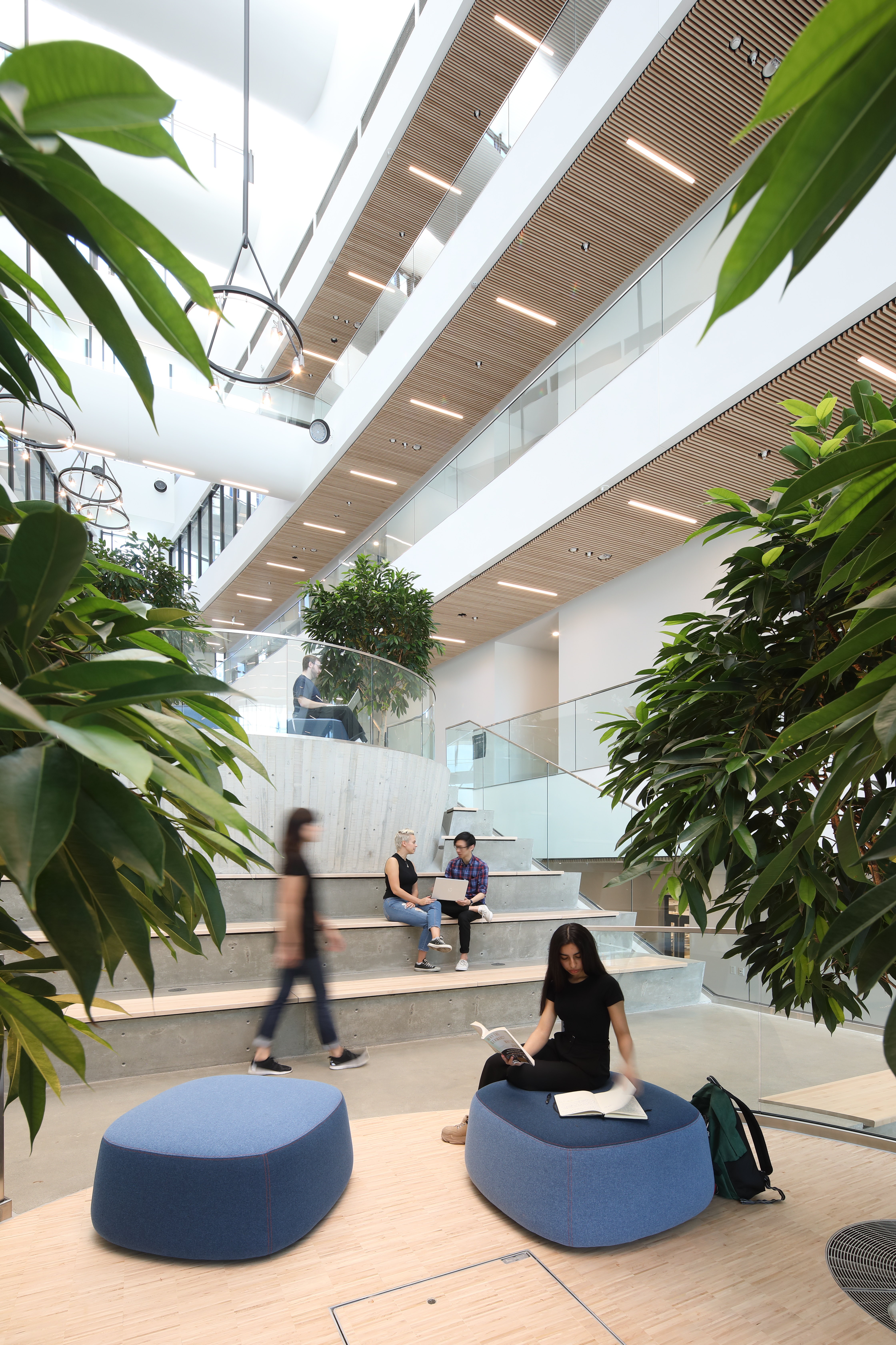 The multi-functional atrium is the main circulation spine and connective core. Integrated spectator seating and a generous ground floor facilitate large formal events while the more intimate pods at each landing offer comfortable space for collaboration, connection, rest, and reflection. Here, the school’s various disciplines can come together in a variety of interactions, opening possibilities for knowledge sharing, innovation, and accelerating discoveries in sustainable development.